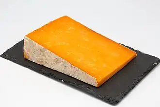 Red Leicester is an orange coloured cow's milk cheese, originally from Leicestershire in England. It has a firm texture, which makes it suitable for grating, and it is a good choice for use in cheese on toast or with a baked potato. At its best, it has a slightly nutty taste.