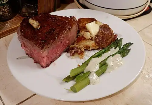 Reverse-searing is a method of cooking steaks, chops, and roasts. The meat is first placed in an oven at a low temperature to cook for an hour or two, until the temperature of the deepest part of the meat is several degrees *below* your target temperature. The meat is then seared to rapidly brown the exterior of the meat. The meat should still be a few degrees below your target temperature, since the temperature will continue to rise while resting thanks to carry-over cooking. There are two major reasons why a person would consider using this method. The first reason is to get better browning on their meat. Raw meat tends to have a fair deal of moisture on the surface, which evaporates and whisks away heat while searing. Slowly cooking the meat before searing dries out the exterior, which gets you better browning. The second reason is to get more consistent doneness inside the meat. When you sear the meat, you get a grey ring of overcooked meat in between the crust formed by the sear and the perfectly cooked meat inside. Conventional searing gets you a worse grey ring, since you need to expose the meat to high heat longer in order to get good browning. Because reverse-seared meats brown better, you don't need to expose the meat as long, getting you wall-to-wall perfection.