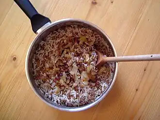 9. Mix the lentils and rice, and top with the fried onion. Use 2 parts lentils to 1 part rice for a moist consistency.