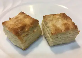 - Roll the dough out to ⅓ inch (1 cm) thick. Cut dough in half or in thirds and stack the large pieces. Roll the stack out until it is about ¾ inch (2 cm) thick. This stacking process produces the layers.