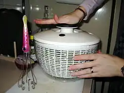 The greens are placed in a large strainer, which fits inside a slightly larger bowl. A lid, which contains a spinning mechanism, is placed on top. The spinning mechanism causes the inside strainer to spin rapidly and usually works by repeatedly pulling a cord or pushing a button on the lid. Centrifugal force removes the excess water from the greens in the central strainer, sending it into the outer bowl.