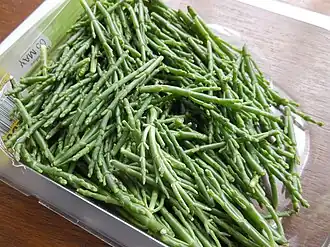Its fleshy, divided, aromatic leaves have long been regarded as a delicacy in Norfolk. It is now appearing as a garnish in London restaurants or can be used a starter. The flavour is highly reminiscent of asparagus hence samphire is sometimes referred to as "Poor Man's Asparagus." It is often sold by fishmongers when in season (from late spring). Well worth trying, if you can find it.