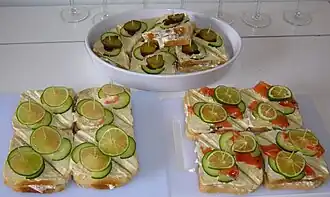Smörgåstårta or sandwich cake is a typical Swedish party dish, not to be confused with Smörgåsbord. The sandwich cake is a very rich sandwich with so much filling it resembles a cake. It is excellent for receptions and parties since it is served cold and can be prepared in advance. It is also possible to have great variation in the fillings to accompany most peoples taste. The dish can be served as a cake or in smaller piece as appetizers.