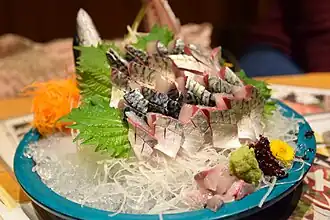 Sashimi is raw meat, sliced very thin. It is typically served with onigiri or sushi. Although the meat used is usually a kind of fish, beef can also be used.
