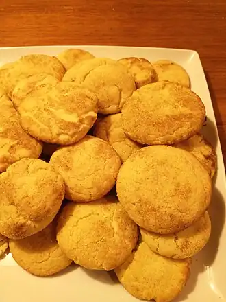 Snickerdoodles are sugar cookies lightly dusted with cinnamon. They have a characteristically crackly surface, and can be crisp or soft, depending on preference. Some variants include nutmeg, raisins, or nuts. They are a traditional Christmas cookie in North America.