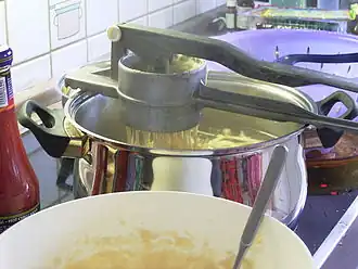 - If using only a board, sweep a spoon of dough over the kitchen board with the grater. Cut/grate small pieces of the dough with the grater into the hot water. If using a spaetzle-maker, put a spoon of dough into the maker and press through the holes into the water. The spaetzle are done when they rise and swim on the water surface.