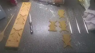- Press a piece of dough in the mold. Cut away the excess dough by using a string or by cutting with a knife, holding it flat against the template.