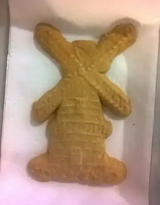 Speculaas is a traditional Dutch spiced biscuit. It is eaten all year round but is mostly associated with pakjesavond, the celebration of Saint Nicholas on the 5th of December. The speculaas can have the shape of this saint, although windmills are a popular design as well. Speculaas gets it design from a template, called a 'speculaasplank'. This is a wooden board with shapes or figures cut in it. The design is better preserved when more flour is added to the dough, but this is not to today's taste anymore.