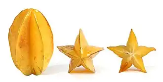 The star fruit, sometimes called the carambola or star apple, is a tropical fruit that is gaining popularity. This fruit acquired its name from the five pointed star shape when cut across the middle of the fruit. It has a waxy, golden yellow to green color skin with a complicated flavor combination that includes plums, pineapples, and lemons. It is usually quite sour.