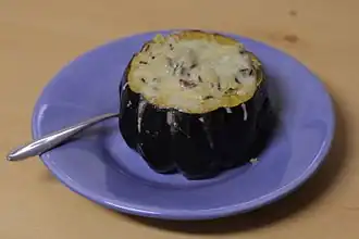 - When the rice is done, pour it into the roasted squash. Grate the cheese on top. Broil a few minutes until the cheese is bubbly and toasty.