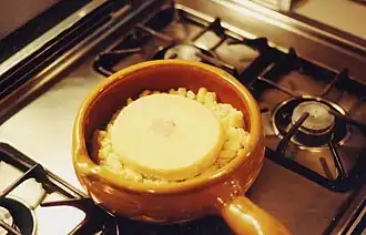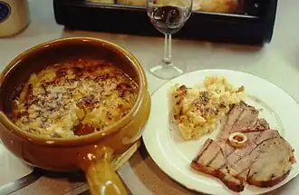 Tartiflette is a French dish from the Savoy region. It originated in the valley of Aravis, home of reblochon cheese. It is not, however, a traditional dish and was, in fact, invented and launched only in the 1980s by the Reblochon trade union in an attempt to increase sales of the cheese. Different valleys in the region have different methods of producing tartiflette and there is probably more than one recipe per village. All recipes have potatoes, cheese, and some kind of meat such as slab bacon or salt pork. One example of a recipe is shown below.