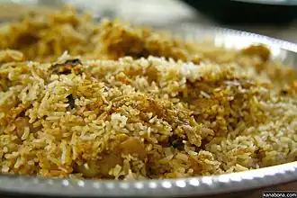 Thalassery biriyani is a rice dish blended with Chicken and Spices. The recipe has a strong legacy of the Mughlai cuisine. This variant of biryani is an Indian cuisine and has originated from the Malabar region of South India.[2] The specialty is the difference in the choice of rice (Basmati rice is not used; small-grained Khaima/Jeerakasala rice is used); Chicken is not fried before adding to the masala. Thalassery biryani is a Pakki biryani where as Hyderabadi is a Kacchi biryani and therefore apparently a dum biryani. There are clear distinctions of taste between Thalassery biryani and other biryani variants.[2]