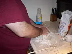 - Spread out parchment paper, and sprinkle with flour. Transfer dough from mixing bowl onto parchment paper. Knead. Repeatedly add more flour until dough feels fairly dry and consistent.
