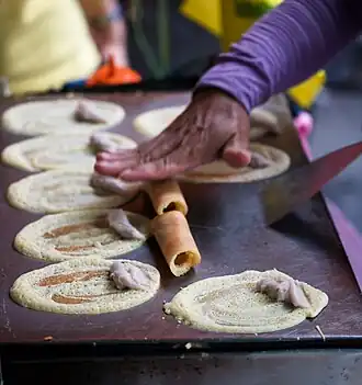 Tokyo pancake (Thai: khanom Tokyo) is a Thai street food consisting of a thin pancake that is filled and rolled. It can be savory or sweet, with fillings such as custard cream, sausage, and quail eggs.