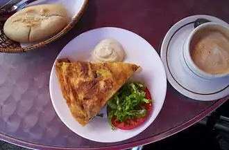 The traditional recipe, shown below, calls for an omelet filled with sauted tomatoes, onions and garlic, seasoned with tarragon, parsley, salt and sometimes basil.[2][3] Variations can include rice and a wide variety of vegetables.