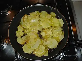 - Peel the potatoes and cut them into small cubes or thin round slices. Sprinkle with salt and leave any excess water to drain from them while heating the oil to around 350°F (177°C) in a large frying pan.