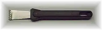 A zester is a tool for removing zest. A common design would be a foot-shaped blade sticking out of a handle, sharp along the toe edge, and with little holes in the toe area. This a scraped over the peel (rind) of a citrus fruit to remove strips of zest.