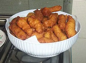 A Zippula (plural: Zippuli) is fried dough from Calabria, Italy. In Calabrian cuisine, zippuli are made with fried potatoes and (sometimes) anchovies. They are also spelled zeplee and zippuile. Though variations exist amongst some Calabrian families, the zippula dough is often prepared with fresh parsley, deep-fried in a skillet, and dipped in marinara sauce when they are cooled to touch.