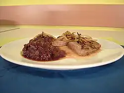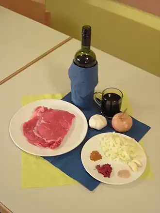 Zwiebelrostbraten is a typical Austrian entrée and an all-time favorite dish in Austria. The meat used for Zwiebelrostbraten is traditionally a standing rib roast cut, which is called “Rostbraten” in German. There are numerous variations of the dish and an abundance of recipes available. This recipe uses a red-wine onion gravy and is adapted from a recipe that was published in a cooking magazine.[1] This recipe is a reduced-calorie version of the original but is nevertheless a flavorful one. The meat juices are also used in the cooking process so their intense flavor will not go to waste.