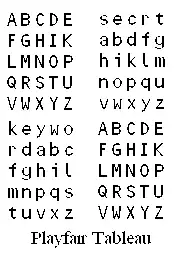 The classic Playfair tableau consists of four alphabets, usually in a square arrangement, two plaintext and two ciphertext. In this example, keywords have been used to disorder the ciphertext alphabets.