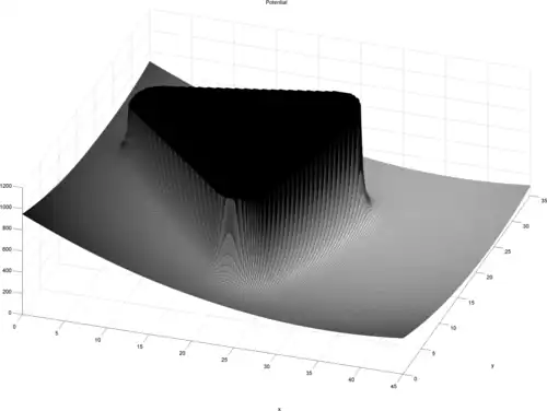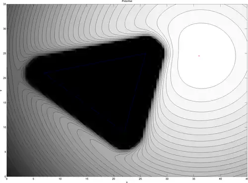 The idea behind potential field is to create a field (or gradient) across the map that will direct the robot to the goal. We consider the robot as a point under the influence of an artificial potential field . The robot moves by following the field, as would a ball rolling downhill. This is possible by giving the goal an attractive force (i.e. the minimum potential) and obstacles very high repulsive force (peaks in the field). On the figures, you see the resulting contour plot for a single triangular obstacle (in blue) and a goal (in red), the same setup is plotted as a 3D field on next picture.