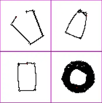 On the picture you can see four of these runs plotted. The top row shows what you might obtain if your odometry is not perfectly calibrated, the loop is not closed or at least not properly. On the third image you see what is returned with a good calibration. It's better but even now this is not a perfect rectangle as the arena is. Finally the fourth picture shows the result of a very long run performed with the best calibration we found. Since the odometry cannot be perfect there will always be a small increase in the error during the run. On a long term this will cause a rotation of the plotted path and on a very long term (several minutes to an hour) we obtain this circle produced ba the rotation of the approximate rectangle.