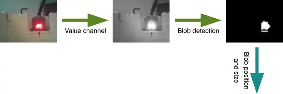 The first figure depicts a possible workflow to detect an alight feeder. The first operation is to get the value channel (with a simple RGB to HSV color space[5] conversion). Then, a blob detection algorithm is applied in order to get the blob corresponding to the source light. Finally, some extreme blobs (too small size, too up blob, etc.) are removed. The resulting blob x-position can be sent more or less directly to the motor. To improve the robustness of the present workflow one may add another blob detection which searches a red glow around the light point.