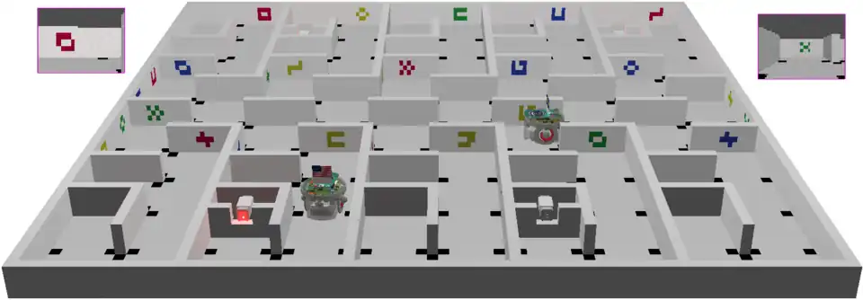 Rat's Life is a cognitive benchmark. In an unknown maze, two e-pucks are in competition for the resources. They have to find energy in feeders to survive. When a feeder has been used, it is unavailable for a while. The contest can be done either in simulation or in reality. The real mazes are composed of Lego© bricks. The figure depicts a simulation of contest on the 6th maze.
