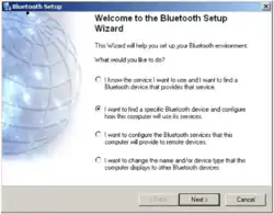 After the installation of your Bluetooth device, an icon named ”My Bluetooth Places” is appeared on your desktop. If it is not the case, right click on the Bluetooth icon in the system tray and select ”Start using Bluetooth”. Double-click on the ”My Bluetooth Places” icon. If you use ”My Bluetooth Places” for the first time, this action will open a wizard. Follow the instructions of this wizard up to arrive at the window depicted in the first figure of the wizard. If you already used ”My Bluetooth Places”, click on the ”Bluetooth Setup Wizard” item. This action will open this window.