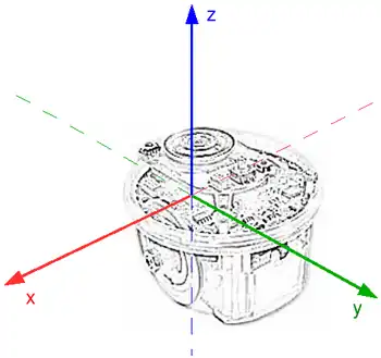 The acceleration can be defined as the change of the instantaneous speed. Its SI units are . The accelerometer is a device which measures its own acceleration (and so the acceleration of the e-puck) as a 3D vector. The axis of the accelerometer are depicted on the figure. At rest, the accelerometer measures at least the gravitational acceleration. The modifications of the motor speeds, the robot rotation and the external forces influence also the acceleration vector. The e-puck accelerometer is mainly used for: