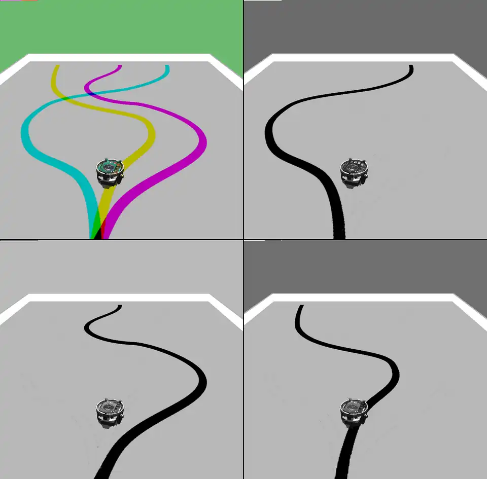 In the actual configuration, the e-puck camera acquires its image in an RGB mode. Webots software uses also this mode of rendering. So, it's easy to separate these three channels and to see only one of these lines. In the code, this will be done by using the wb_camera_image_get_red(...), wb_camera_image_get_green(...) and wb_camera_image_get_blue(...) functions of the webots/camera.h library.