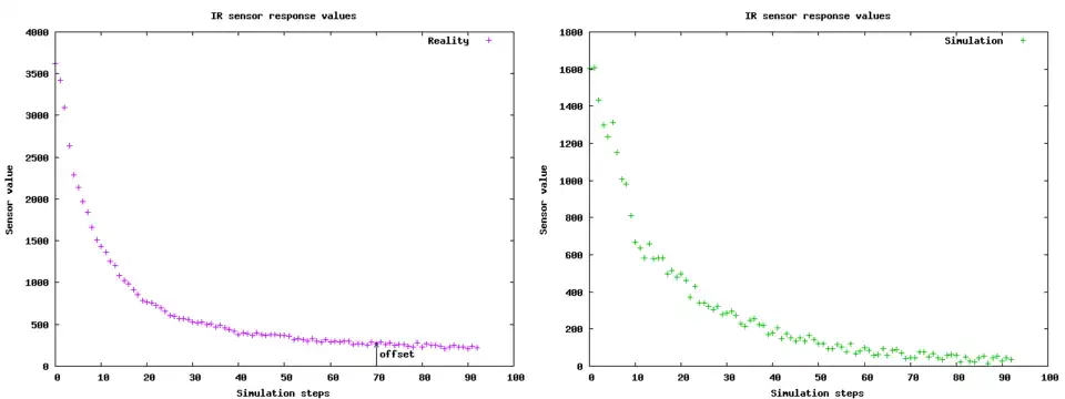 Firstly, they can measure the distance between them and an obstacle. Indeed, the IR emitter emits infrared light which bounce on a potential obstacle. The received light is measured by the photo-sensor. The intensity of this light gives directly the distance of the object. This first use is probably the most interesting one because they enable to know the nearby environment of the e-puck. In Webots, an IR sensor in this mode of operation is modeled by using a distance sensor. Note that the values measured by an IR sensor behave in a non linear way. For illustrating this fact, the following experience was performed. An e-puck is placed in front of a wall. When the experiment begins, then the e-puck moves backwards. The values of the front right IR sensor are stored in a file. These values are plotted in the figure. Note that the time steps are not identical for the two curves. The distance between the e-puck and the wall grows linearly but the measures of the IR sensor are non-linear. Then, observe the offset value. This value depends principally of the lighted environment. So, this offset is often meaningless. Note also that the distance estimation depends on the obstacle (color, orientation, shape, material) and on the IR sensor (properties and calibration).