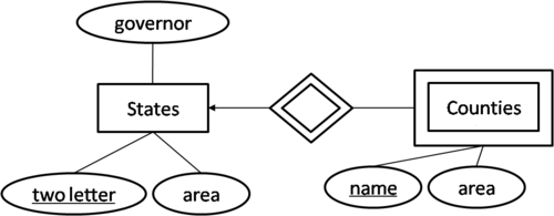 There can be many counties with the same name in different states. For example, counties with the name of Montgomery are in Virginia, Texas, Maryland, so on. So the name of a county cannot be the key for the entity of counties. However, a key for counties can be acquired by combining the name of states and the name of the county. Such entities that do not have key in their attributes are called weak sets or weak entities. The keys of such entities can be acquired from attributes of certain related entities. The related entities are often called identifying entities. The relation from the weak set to its identifying entities are called identifying relations.