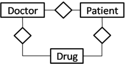 The 2=way relations in the diagram are (A,B), (B,C), and (C,A). The three binary relations have different meaning with the given ternary relation. For example, association of a set of doctors with a certain pair of a patient and a drug cannot be modeled with the binary relationships.