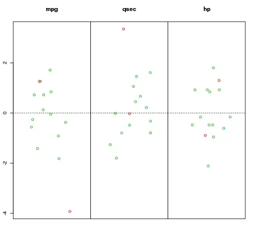 It is worth noting that exceptions are found by analyzing the correlation among each feature of the car. For example, the red dot next to the value 0 in column qsec would not be an outlier if it were analyzed separately, but as the correlation is considered the point is an outlier.