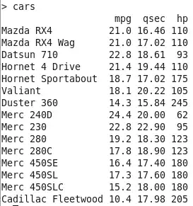 > cars = mtcars[1:15, c("mpg", "qsec", "hp")]
