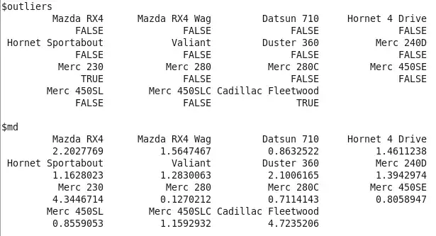 To find out the cars that stands out we analyze the second figure. Clearly we can see the outliers marked as TRUE. So the outliers are Merc 230 and Cadillac Fleetwood. Now the collector life is easier. It only remains to identify what kind of "stand out" the collector is interested. Looking the #Filtered Dataset, we can note that the car Merc 230 is very economical, but slower and less powerful and we can see too that the Cadillac Fleetwood is very fast and powerful, but consume too much fuel. As a good collector, he will likely choose the Cadillac Fleetwood, because it was probably the most desired car.
