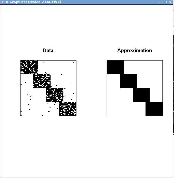 Here we have an example of proximus algorithm processing. The example is quite simple and gives an idea of how it works. Basically, a uniform logical matrix is generated. Then proximus does a rank-4 aproximattion of original logical matrix.