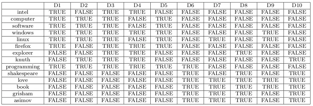 The table below shows 14 terms and 10 documents. Clearly, there are two groups of words: those that are related to computers and those that are related to authors. The word love is isolated.