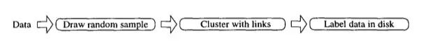 The steps involved in clustering using ROCK are described in the following figure. After drawing a random sample from the database, a hierarchical clustering algorithm that employs links is applied to the sampled points. Finally, the clusters involving only the sampled points are used to assign the remaining data points on disk to the appropriate clusters. In the following subsections, we first describe the steps performed by ROCK in greater detail.