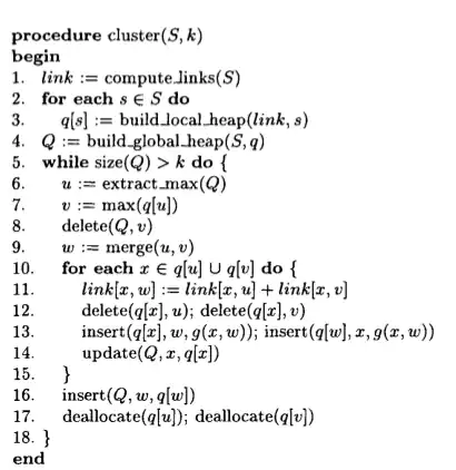 In addition to the local heaps q[i] for each cluster i, the algorithm also maintains an additional global heap Q that contains all the clusters. Furthermore, the clusters in Q are ordered in the decreasing order of their best goodness measures. Thus, g(j,max(q[j])) is used to order the various clusters j in Q, where max(q[j]), the max element in q[j], is the best cluster to merge with cluster j. At each step, the max cluster j in Q and the max cluster q[j] are the best pair of clusters to be merged.