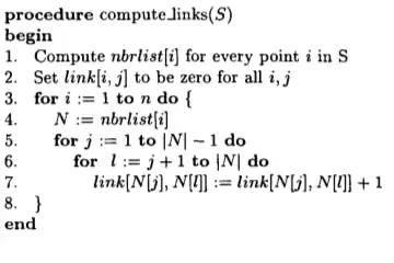 For every point, after computing a list of its neighbors, the algorithm considers all pairs of its neighbors. For each pair, the point contributes one link. If the process is repeated for every point and the link count is incremented for each pair of neighbors, then at the end, the link counts for all pairs of points will be tained. If Mi is the size of the neighbor list for point i, then for point i, we have to increase the link count by one in M^2i entries. This, the complexity of the algorithm is the sum of M^2i which is O(N * Mm * Ma), where Ma and Mm are the average and maximum number of the neighbors for a point, respectively. In the worst case, the value of Mm can be n in which case the complexity of the algorithm becomes O(Ma * N^2). In practice, we expect Mm to be reasonably close to Ma and thus, for these cases, the complexity of the algorithm reduces to O(M^2a * n) on average.