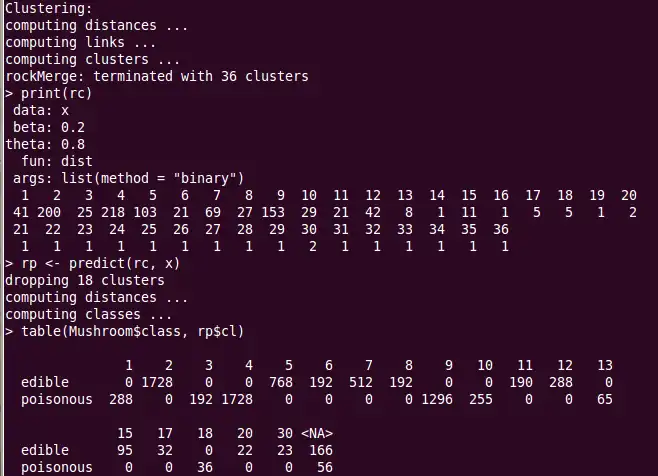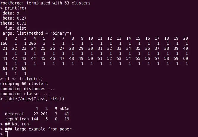 data(Votes) x <- as.dummy(Votes[-17]) rc <- rockCluster(x, n=2, theta=0.73, debug=TRUE) print(rc) rf <- fitted(rc) table(Votes$Class, rf$cl)