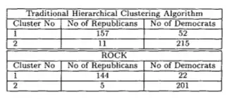 As the table illustrates, ROCK and the traditional algorithm, both identify two clusters, one containing a large number of republicans and the other containing a majority of democrats. However, in the cluster for republicans found by the traditional algorithm, around 25% of the members are democrats, while with ROCK, only 12% are democrats. The improvement in the quality of clustering can be attributed to the usage of links by ROCK.