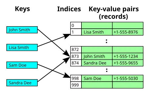 A hash table, or a hash map, is a data structure that associates keys with values. The primary operation it supports efficiently is a lookup: given a key (e.g. a person's name), find the corresponding value (e.g. that person's telephone number). It works by transforming the key using a hash function into a hash, a number that the hash table uses to locate the desired value. This hash maps directly to a bucket in the array of key/value pairs, hence the name hash map. The mapping method lets us directly access the storage location for any key/value pair.