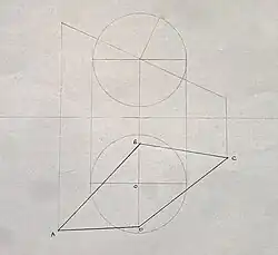 1. In top view, locate the apparent piercing points, where each side of the given plane crosses the base of the cylinder. 2. Project these piercing points to the front view and mark them where they meet the same side of the plane. 3. To find more points that make up the plane of intersection, use cutting planes and traces: a. Pick a point on the base in top view (should lie inside the given plane and along the base of the cylinder). b. Draw a line (represents the edge view of the cutting plane) that contains that point, across the given plane. c. Project the line and the piercing point down to the front view. The piercing point (in the front view) is located on that line. d. Connect these piercing points (in the front view), taking visibility into consideration, to find the plane of intersection.
