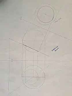 Intersection between Complex Solids with Complex Solids Cylinder and Cylinder Cone and Cylinder First determine if the two complex solids have axis that are parallel to each other. If not, the first step is to construct a plane that contains a line that is parallel to the axis of both the complex solids which intersects each solid in top view. If the faces of the shapes are not coplanar, extend one in front view until they have a common base plane. Construct cutting planes that intersect the bases of the two solids parallel to the previously constructed plane to determine the intersections between the planes and the solids as shown in figure Project the intersecting points obtained in the second step onto the corresponding solid in the other view. Using those points of intersection, construct lines parallel to the axis of that solid so it intersects the solids in the same view that you used for the step above. Mark the intersections that are generated from the same cutting plane. The two complex solids intersect at these points. Join the intersecting points to get the shape where the two solids intersect each other. Project the above obtained points corresponding to the solids in the other view to obtain the shape of the intersecting plane. Note: You should use a good number of intersecting planes and follow the steps above to obtain an accurate shape of intersection.
