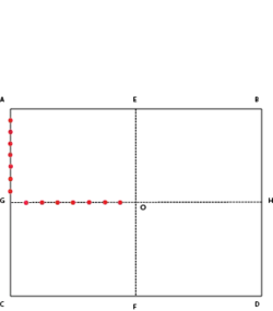 1. Create a rectangle ABCD. Find the midpoints of each line and connect the points to divide the rectangle into quadrants. Divide AG and GO into equal number of parts using the division method.