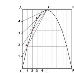 1. Start with rectangle ABCD. Find midpoints of AB and CD and connect. Divide CE and AC into equal parts. Draw a perpendicular line to CE on each of the points on CE.