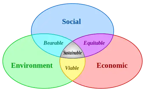 Sustainable development implies economic growth together with the protection of environmental quality, each reinforcing the other. Sustainable development is maintaining a delicate balance between the human need to improve lifestyles and preserving natural and cultural ecosystems. The field of sustainable development can be conceptually broken into three constituent parts: environmental sustainability, economic sustainability and sociopolitical sustainability. The essence of this form of development is a stable relationship between human activities and the natural world, which does not diminish the prospects for future generations to enjoy a quality of life at least as good as our own. Participatory democracy is a prerequisite for achieving sustainable development. (see ⇒ participation)